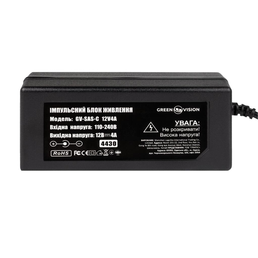 Імпульсний блок живлення закритого типу GV-SAS-C 12V4A (48W) – вхідна напруга 110-240 В, вихідна напруга 12 В. Сила струму на виході 4000 A (48W).